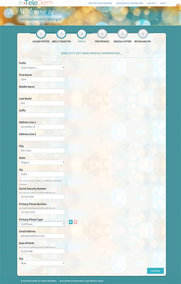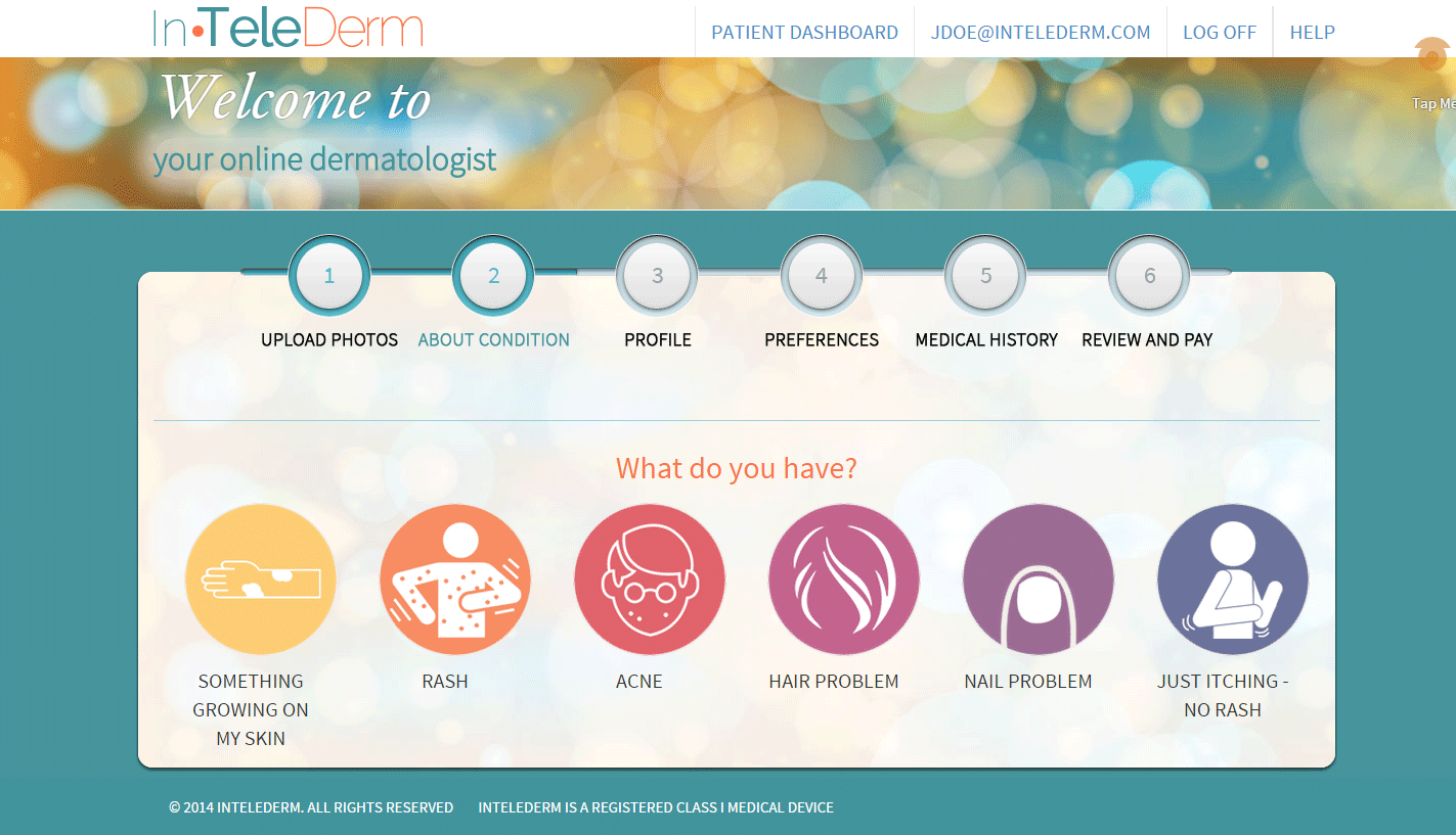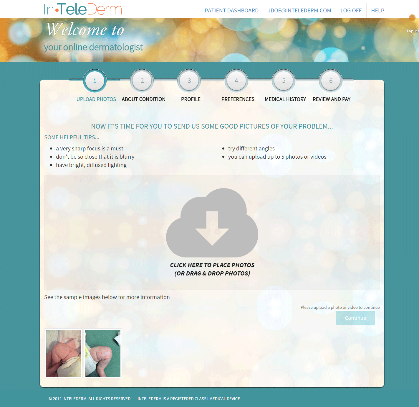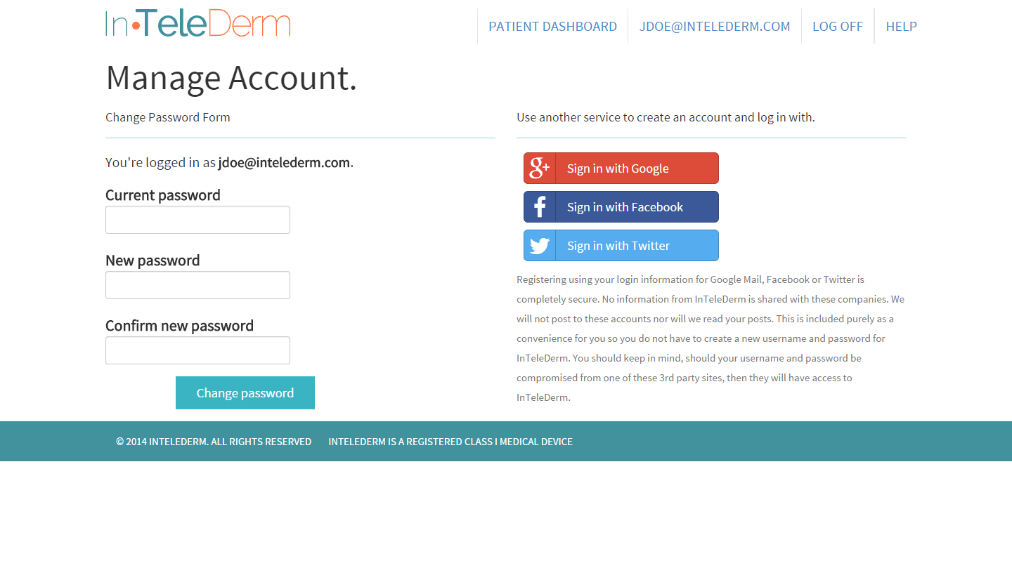 Welcome to InTeleDerm, Your online dermatologist. InTeleDerm allows you to be seen by a dermatologist without the hassle of going to a doctor's office. The first step to using InTeleDerm is to register for an account. This can be done by clicking on the Register link at the top of the page. To register for InTeleDerm please fill out the information on the left or click one of the options on the right to create an account using your Google, Facebook, or Twitter login information. When creating a password for InTeleDerm your e-mail address will be your username and passwords must be at least 8 characters in length and consist of a number, a special character, an upper case and a lower case letter.