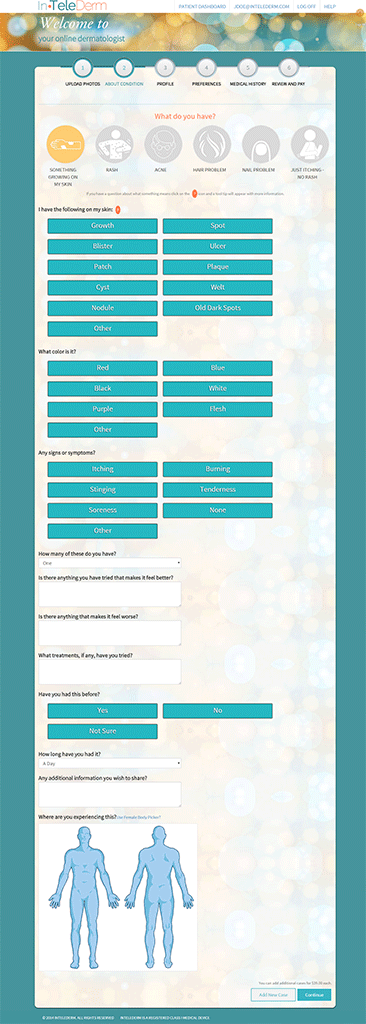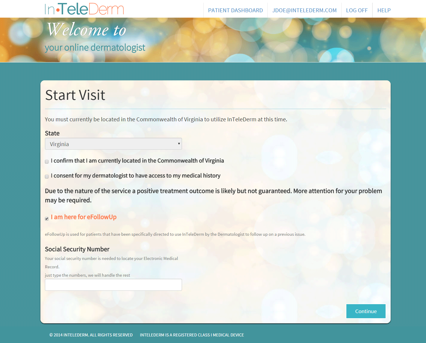The first time you create a case you will be presented with the Start Visit page. Currently we are only located in the Commonwealth of Virginia. If you are not physically present in the Commonwealth of Virginia at the time you are creating the case, then you are not able to utilize InTeleDerm at this time. In order to proceed you must confirm that you are located in the Commonwealth of Virginia and consent to your dermatologist having access to your medical history.