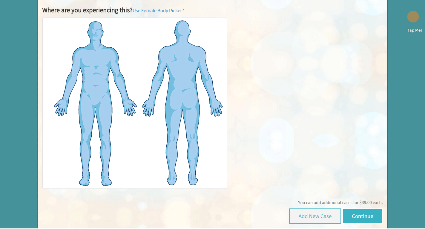 After you've answered the question, click on the area of the body where you are experiencing your concern. You can click on multiple body locations. Once you are done filling out this case, you can create an additional case. If you don't want to create an additional case, press continue to move on.