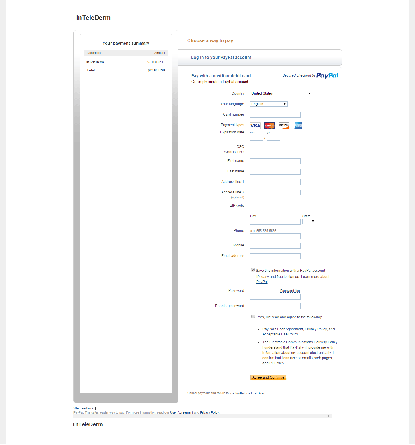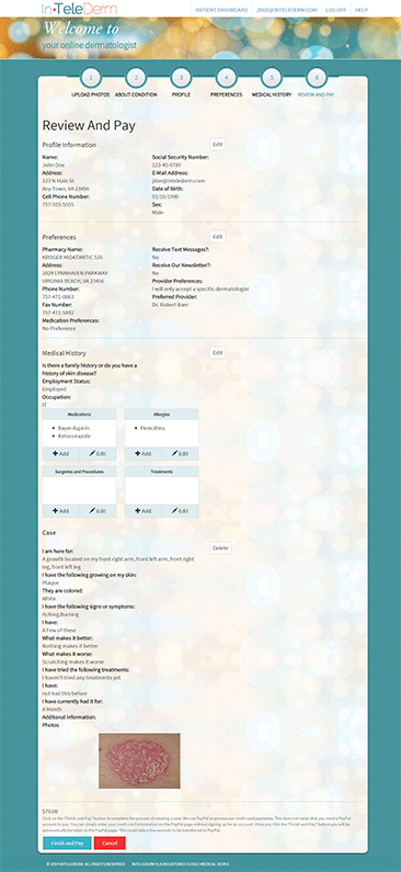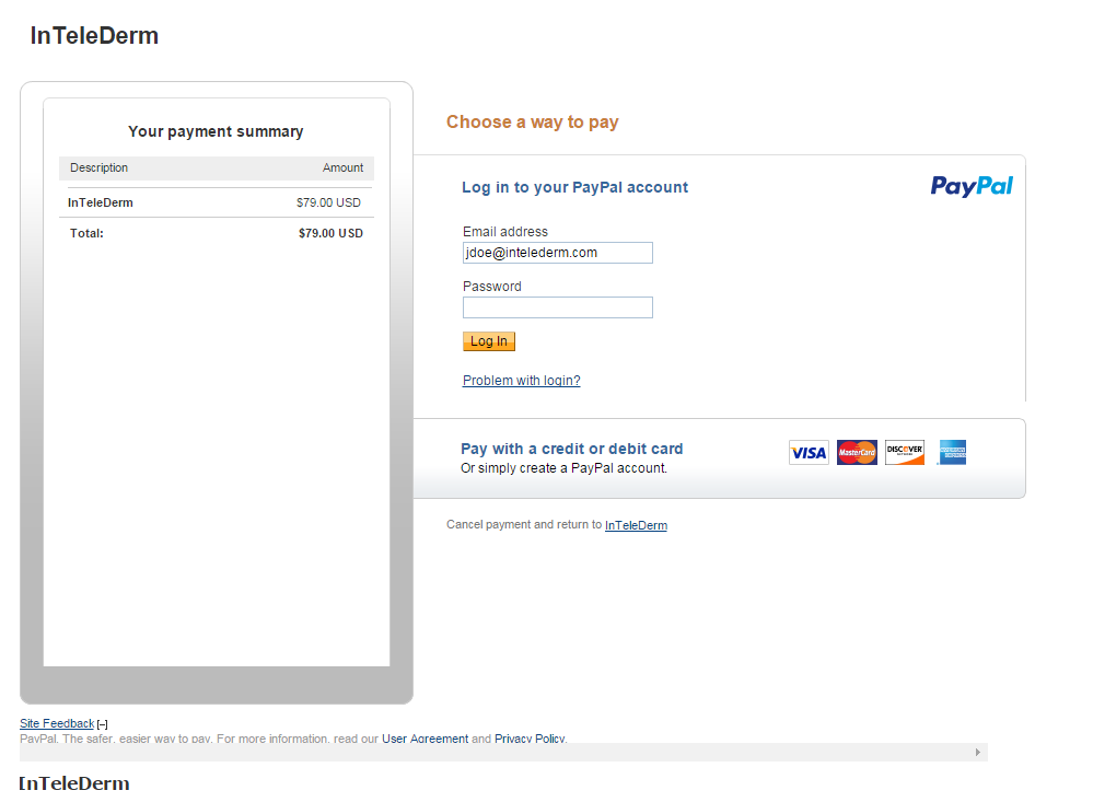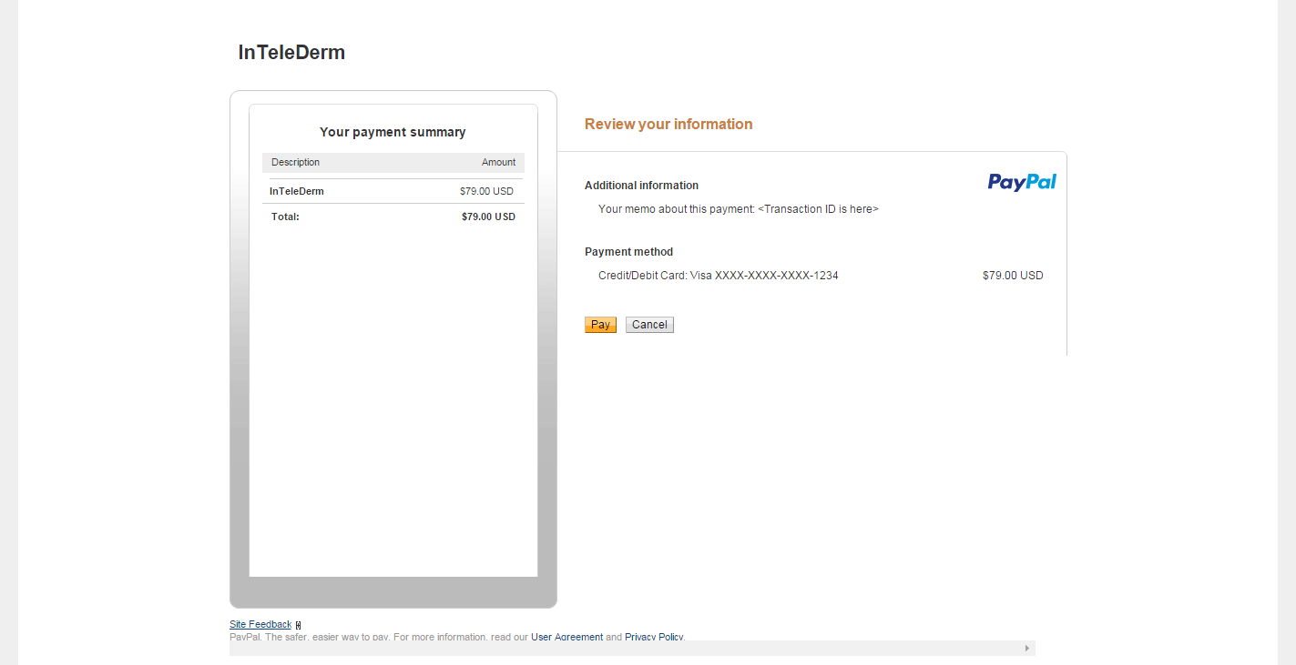 Once you've entered all of your information, click on the pay button. You will then be taken back to your patient dashboard on InTeleDerm.