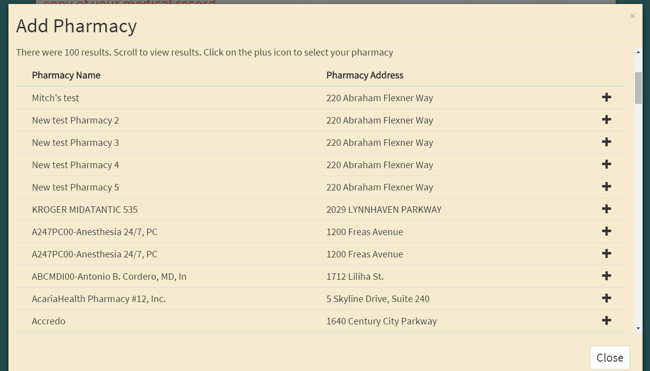 This will search through a list of over 60,000 pharmacies. The ones that match your search criteria will be displayed. Scroll through and click on the plus to select your pharmacy.